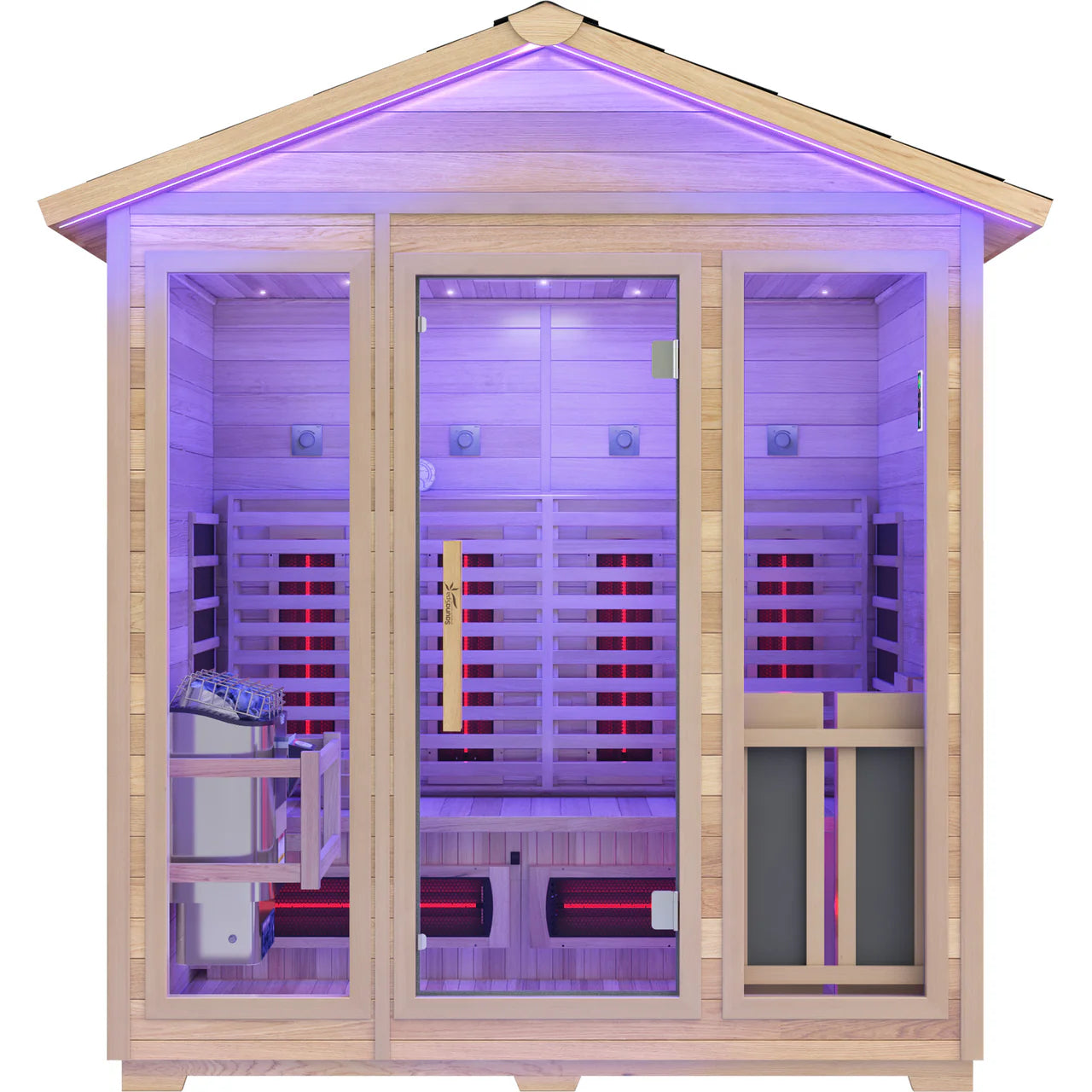 The SaunaSpa 3-4 Person Outdoor Cabin Sauna is designed for outdoor use and year-round relaxation. Waterproof infrared heating panels and red light heating tubes heat up to 149F. Crafted with Canadian red cedar and hemlock. The infrared panels and ETL-certified 6.2kW rock heater. Bitumen roof shingles protect against rain and UV damage, and chromotherapy lighting for a calming ambiance. Complete with an 8mm clear tempered glass door, it brings professional wellness to your own backyard.