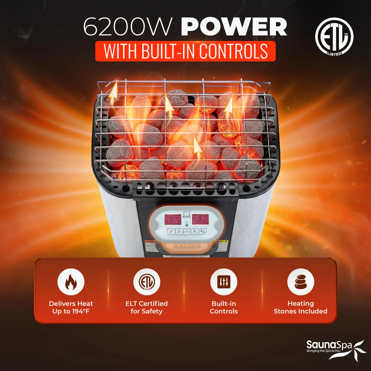 - 6.2KW ROCK HEATER: ETL-certified sauna rock heater provides authentic wet sauna heat up to 194F (set temperature: 158F-194F)